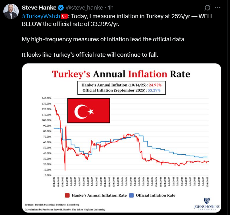Hanke, yaptığı paylaşımda, “Bugün Türkiye’de yıllık enflasyonu yüzde 25 olarak ölçüyorum — bu oran resmi yüzde 33,29’un oldukça altında. Yüksek frekanslı ölçümlerim genellikle resmi verilerden önce gelir. Görünüşe göre Türkiye’nin resmi oranı düşmeye devam edecek” ifadelerini kullandı.