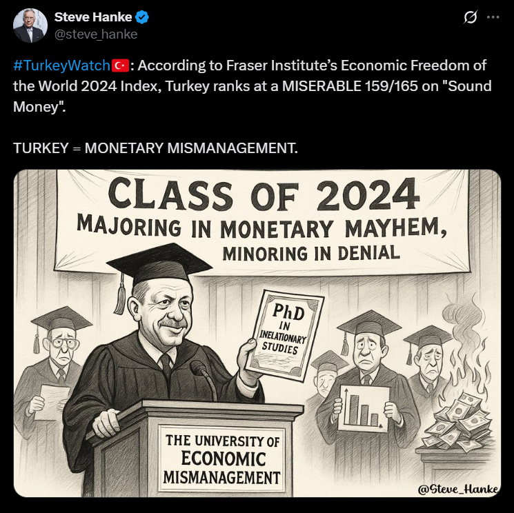 Ekonomist, ayrıca Fraser Enstitüsü’nün yayımladığı 2024 Dünya Ekonomik Özgürlük Endeksi’ne atıfta bulunarak, Türkiye’nin “sağlam para politikası” kategorisinde 165 ülke arasında 159. sırada yer aldığını hatırlattı. Hanke, paylaşımını “Türkiye = Para politikası yönetiminde başarısızlık” notuyla tamamladı.